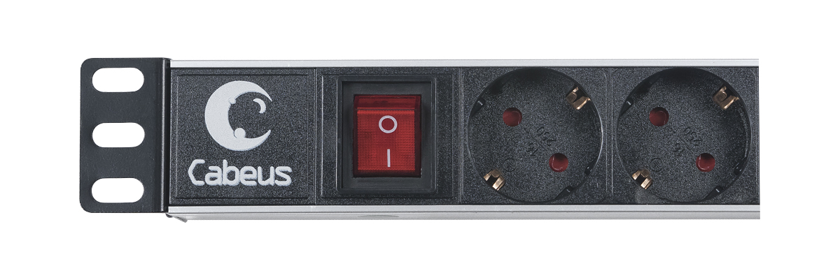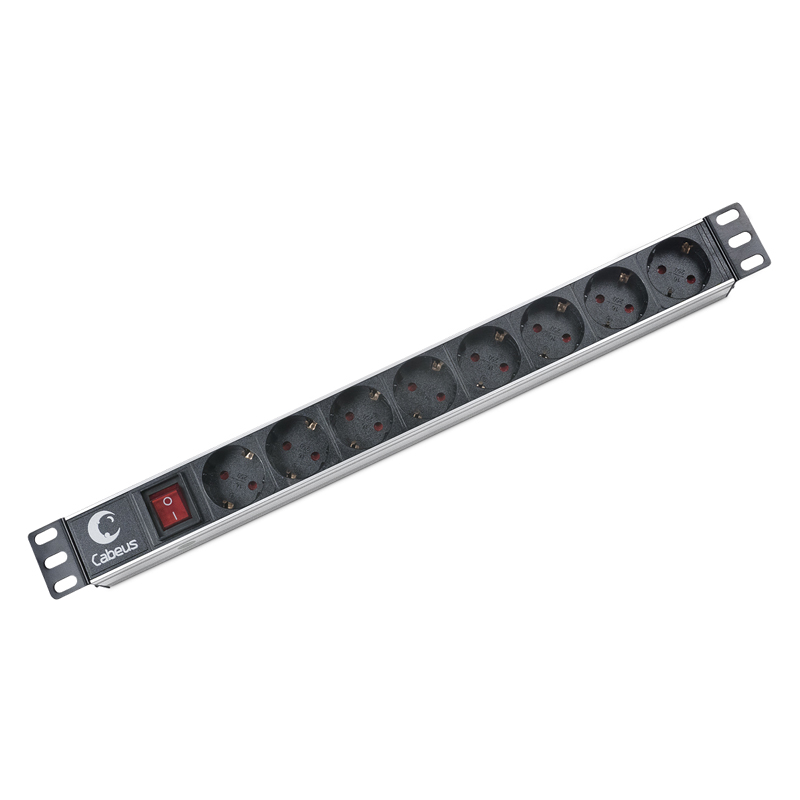 Cabeus PDU-8P Блок евророзеток для 19" шкафов, горизонтальный, 8 розеток, 10 A, выключатель, гнездо под шнур, алюминиевый корпус