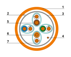 - Внешняя оболочка выполнена из не распространяющего горение LSZH-компаунда, малодымного и не выделяющего ядовитых соединений в процессе горения, исполнение нг(A)-HF.