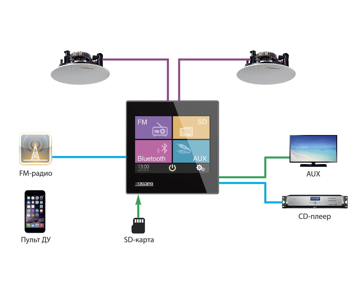 Это компактное и стильное решение для фонового озвучивания небольших помещений. Устройство объединяет в себе цифровой усилитель класса D (2x10 Вт) и мультимедийный плеер с поддержкой Bluetooth, FM-радио и популярных аудиоформатов (MP3, FLAC, WAV и др.). Всё управление осуществляется через яркий 3.5" сенсорный экран.