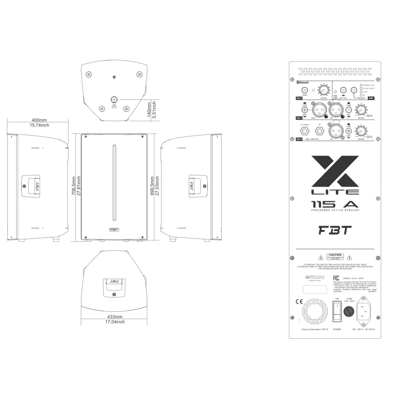 FBT X-LITE 115A - двухполосная, активная акустическая система с 15' НЧ динамиком мощностью 1200Вт и 1-дюймовым компрессионным ВЧ драйвером мощностью 300 Вт, соединенный рупором с направленностью 90 ` Г x 60 ` В.