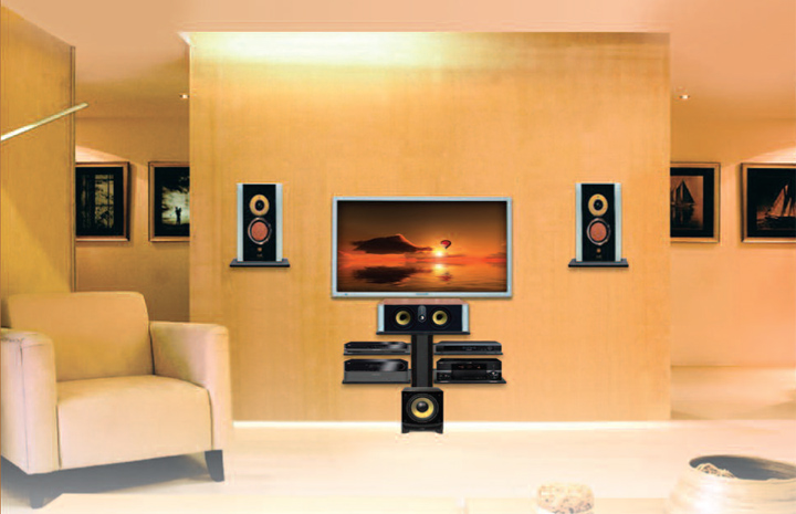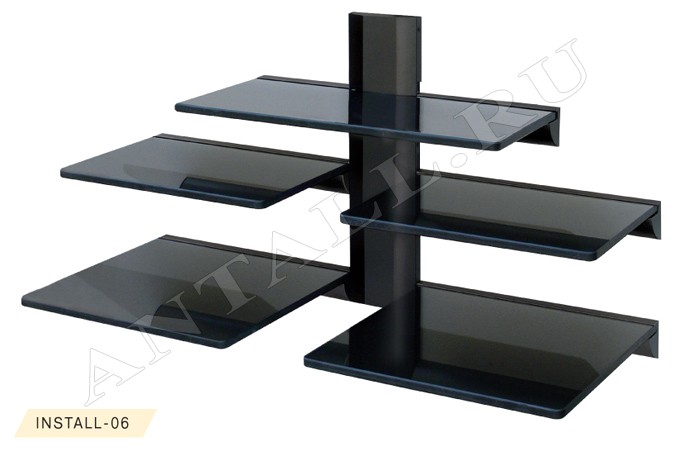 Стеклянная полка под телевизор ANTALL INSTALL-06 предназначена для размещения на стене пяти компонентов: акустической системы центрального канала, двух не глубоких компонентов расположенных на одном уровне и двух глубоких компонентов расположенных на одном уровне.