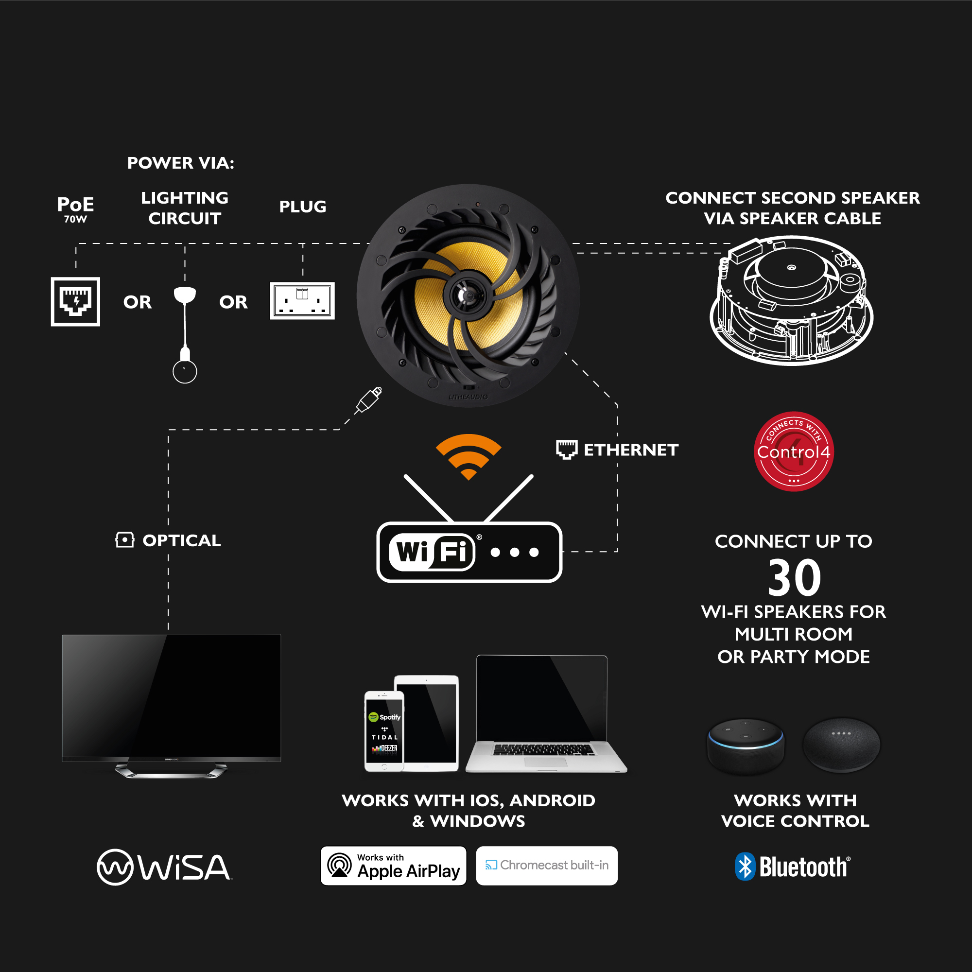 Самая топовая Hi-End система встраиваемых активных Wi-Fi колонок в линейке Lithe Audio. В этой модели реализована впервые поддержка двух диапазонов Wi-Fi 2.4/5 Ггц, а также система оснащена оптическим входом Toslink и опциональной поддержкой питания через PoE (питания подается по витой паре UTP).