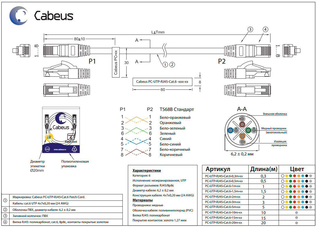 - Диаметр кабеля: 6,2 мм ±0,2 мм