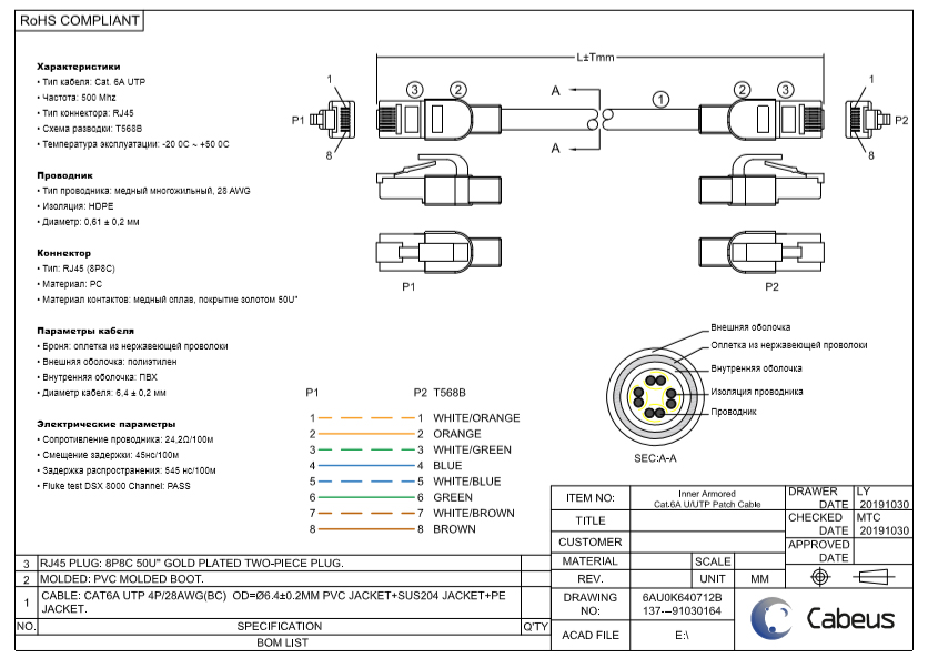 Патч-корд выполнен в неэкранированном исполнении категории 6а. Имеет армирование в виде гофрированной стальной ленты.