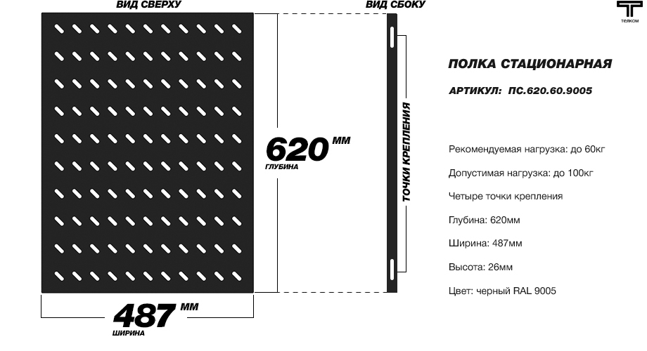 Поверхность полки имеет перфорацию для дополнительной вентиляции оборудования и уменьшения веса конструкции.