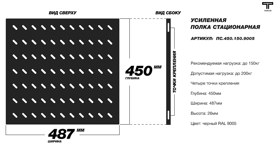 Поверхность полки имеет перфорацию для дополнительной вентиляции оборудования и уменьшения веса конструкции.