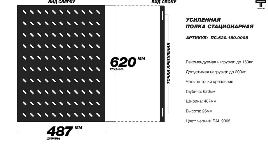 Поверхность полки имеет перфорацию для дополнительной вентиляции оборудования и уменьшения веса конструкции.
