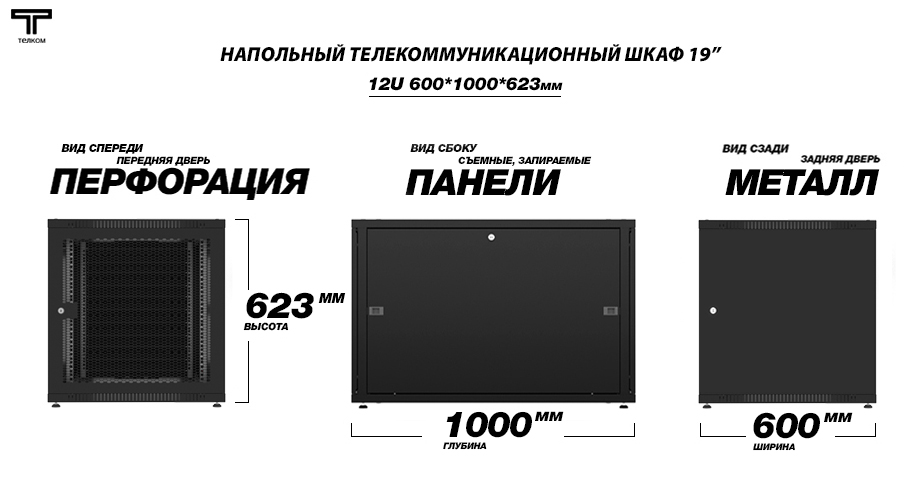 - Тип размера: 12U (ШхГхВ) 600х1000x623мм.