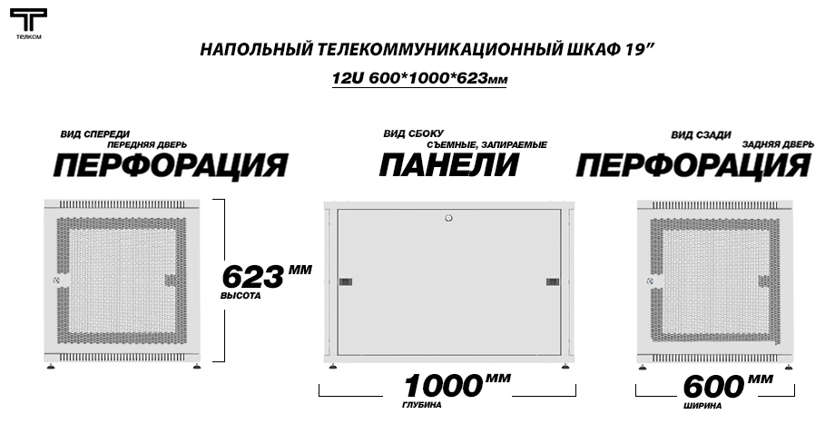 - Тип размера: 12U (ШхГхВ) 600х1000x623мм.