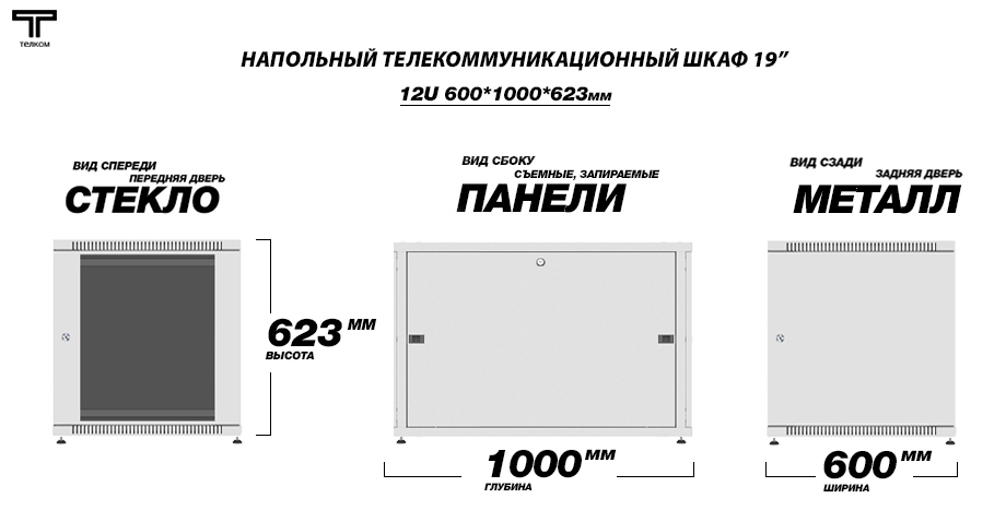- Тип размера: 12U (ШхГхВ) 600х1000x623мм.
