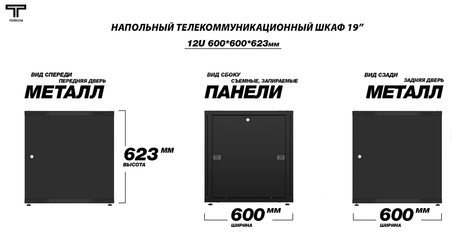 - Тип размера: 12U (ШхГхВ) 600х600x623мм.