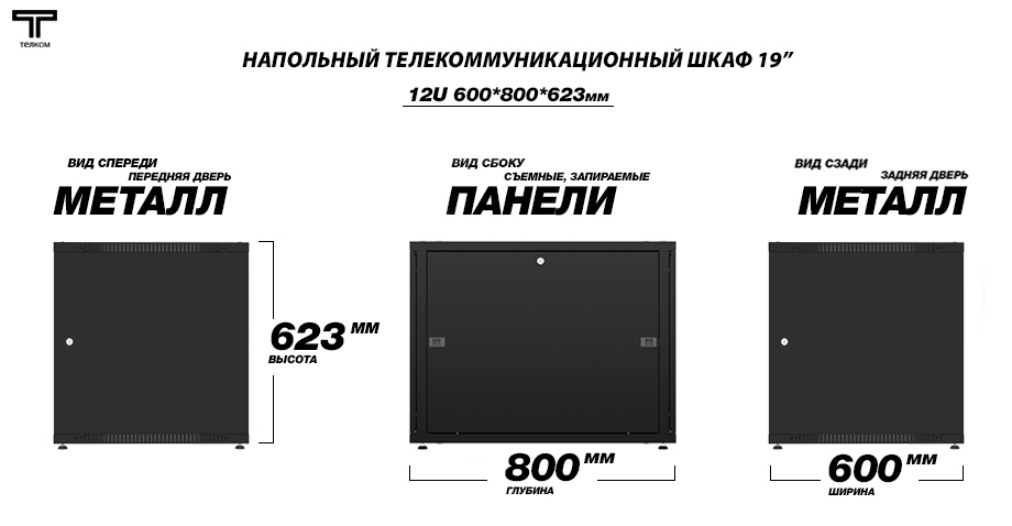 - Тип размера: 12U (ШхГхВ) 600х800x623мм.