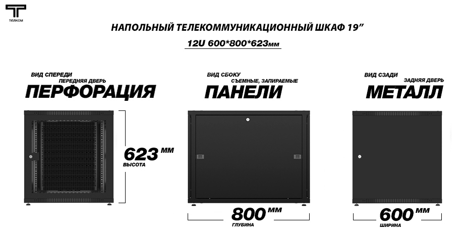 - Тип размера: 12U (ШхГхВ) 600х800x623мм.