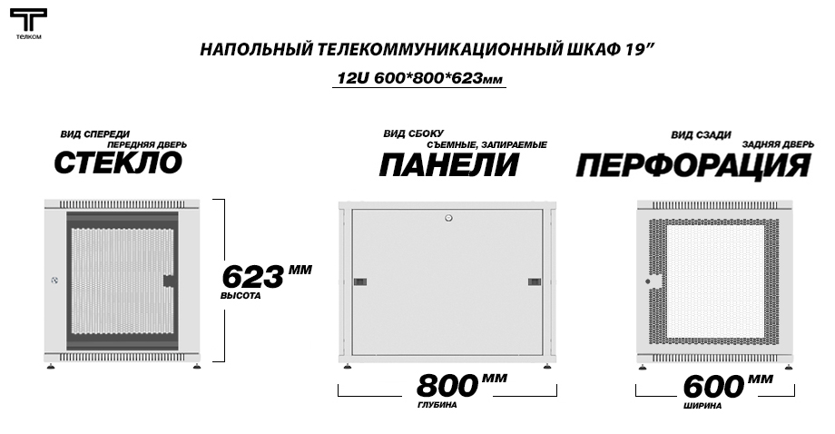- Тип размера: 12U (ШхГхВ) 600х800x623мм.