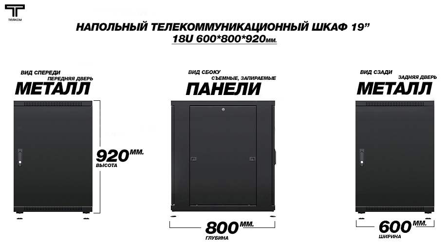 Шкаф напольный 18U телекоммуникационный 19" ТЕЛКОМ ТC-18.6.8-ММ.9005М