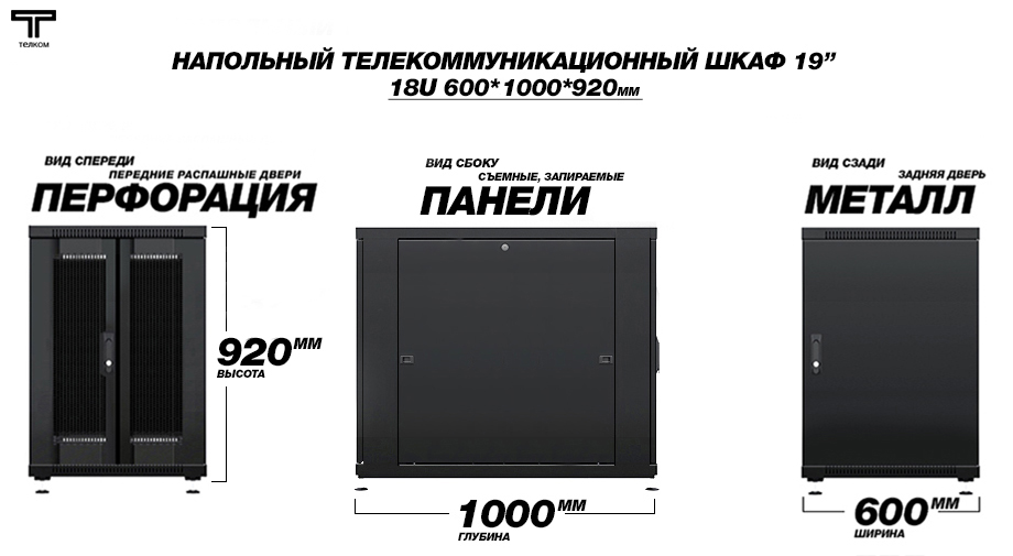 - Тип размера: 18U (ШхГхВ) 600х1000x920мм.