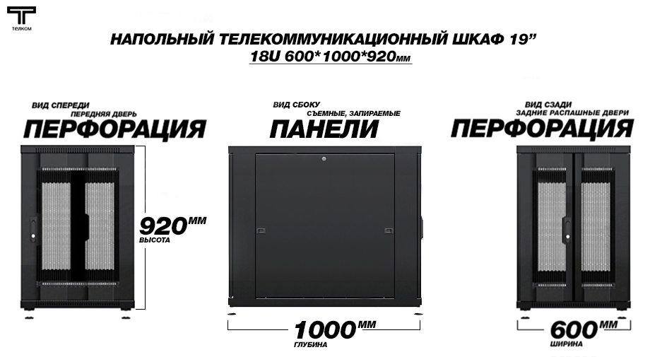 - Тип размера: 18U (ШхГхВ) 600х1000x920мм.