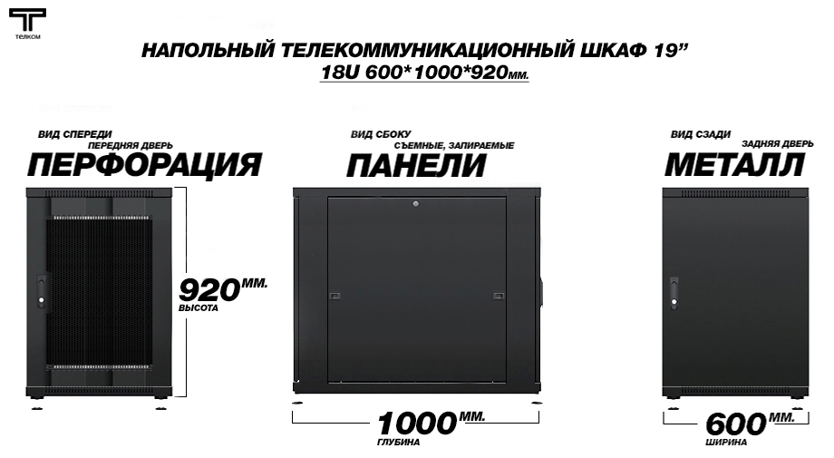 - Тип размера: 18U (ШхГхВ) 600х1000x920мм.