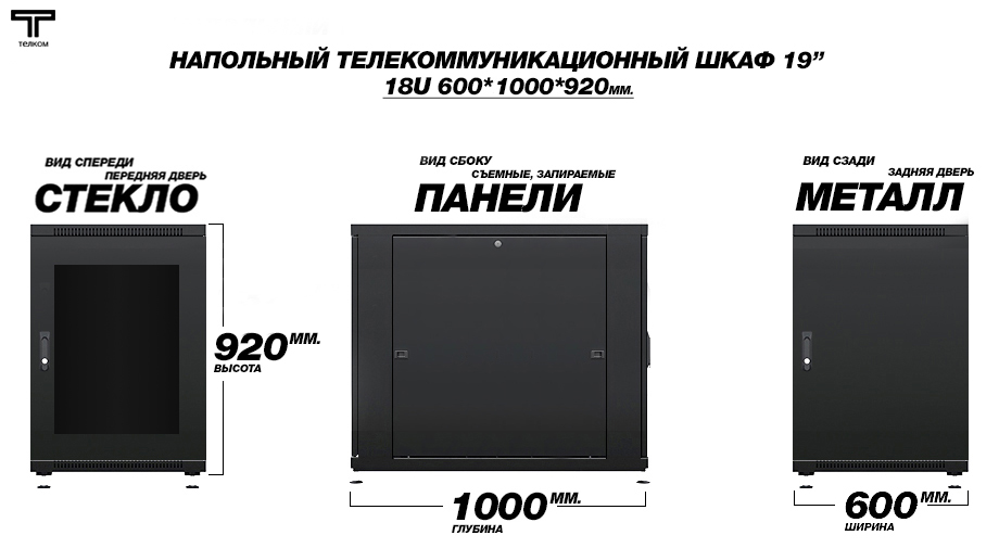 - Тип размера: 18U (ШхГхВ) 600х1000x920мм.
