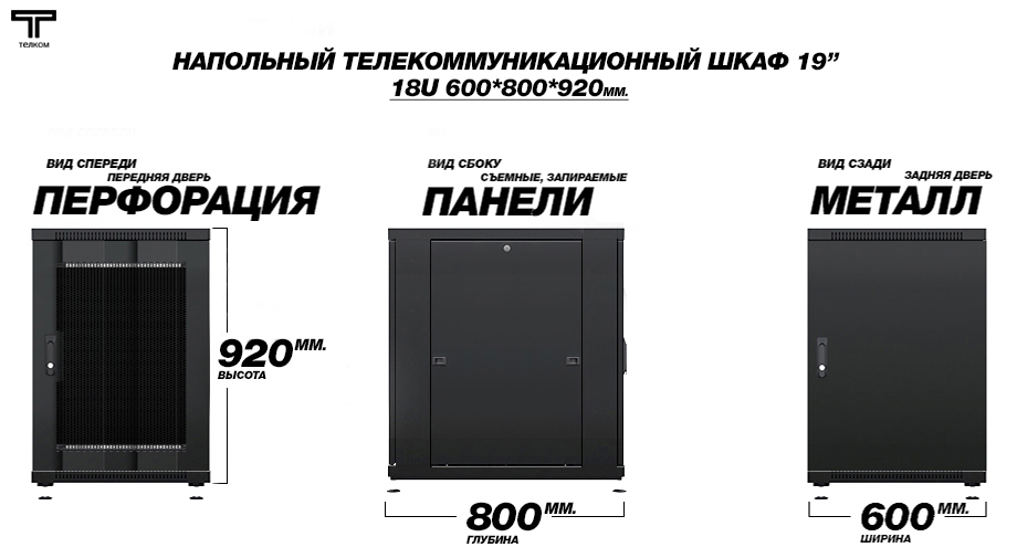 Шкаф напольный 18U телекоммуникационный 19" ТЕЛКОМ ТС-18.6.8-ПМ.9005М
