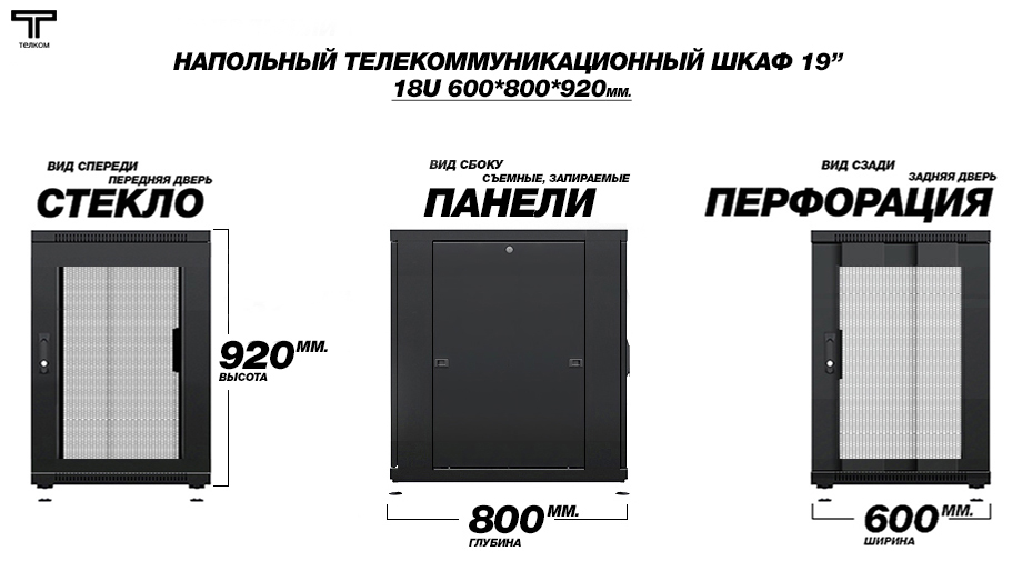 Шкаф напольный 18U телекоммуникационный 19" ТЕЛКОМ ТС-18.6.8-СП.9005М