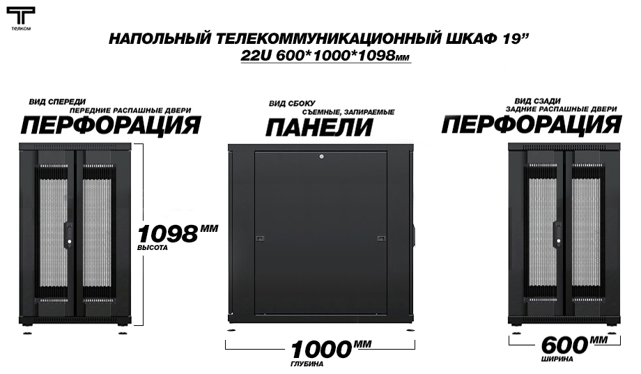 Шкаф напольный 22U телекоммуникационный 19" ТЕЛКОМ ТС-22.6.10-2П2П.9005М