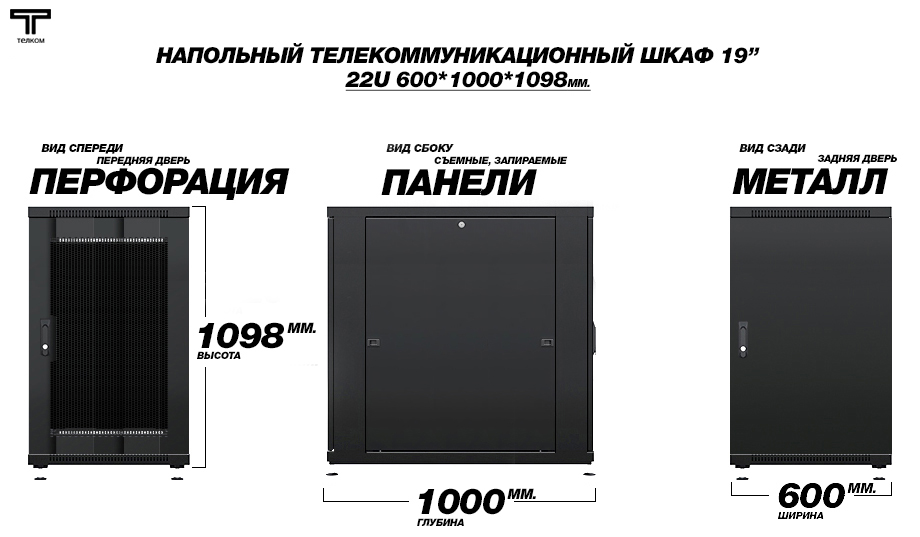 Шкаф напольный 22U телекоммуникационный 19" ТЕЛКОМ ТС-22.6.10-ПМ.9005М