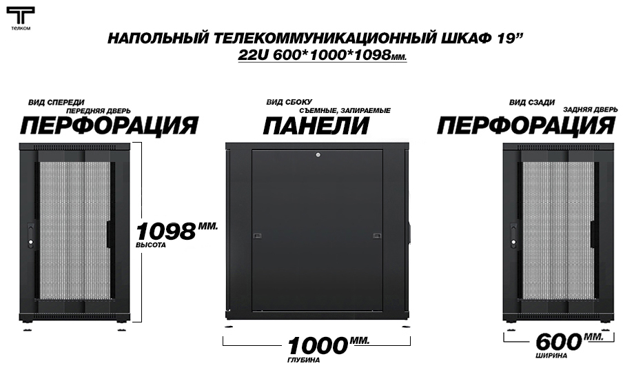 - Тип размера: 22U (ШхГхВ) 600х1000x1098мм.