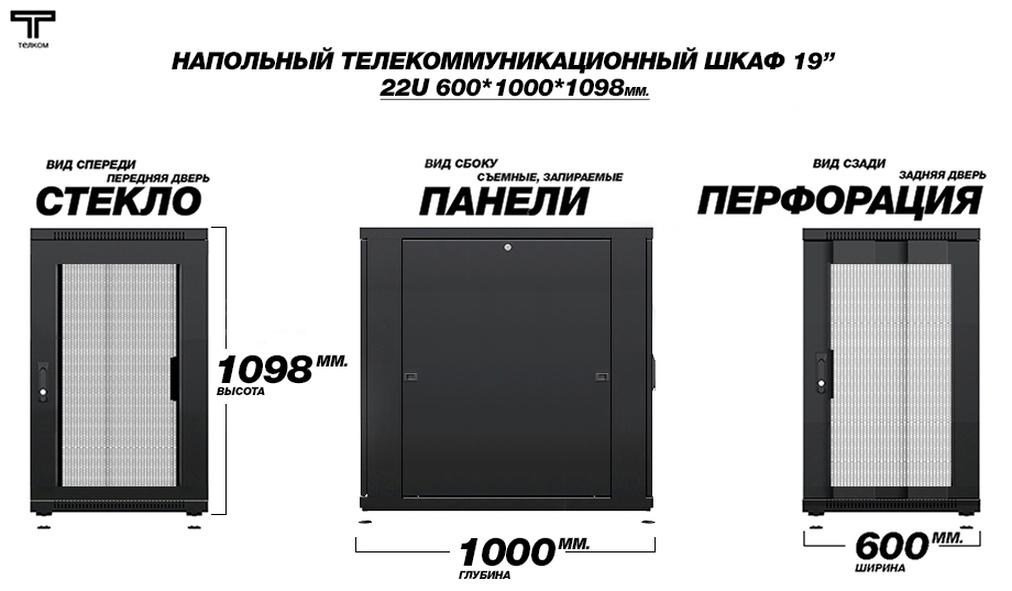 - Тип размера: 22U (ШхГхВ) 600х1000x1098мм.