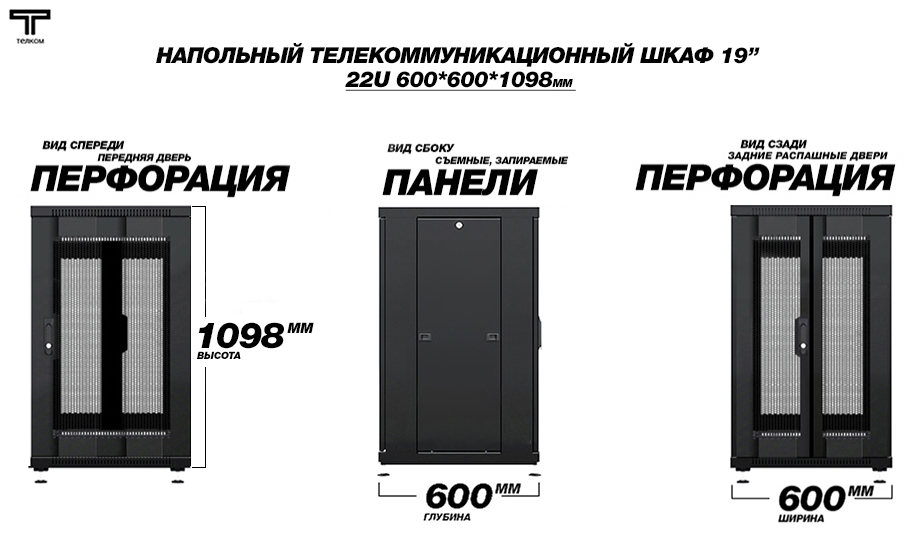 Шкаф напольный 22U телекоммуникационный 19" ТЕЛКОМ ТС-22.6.6-П2П.9005М