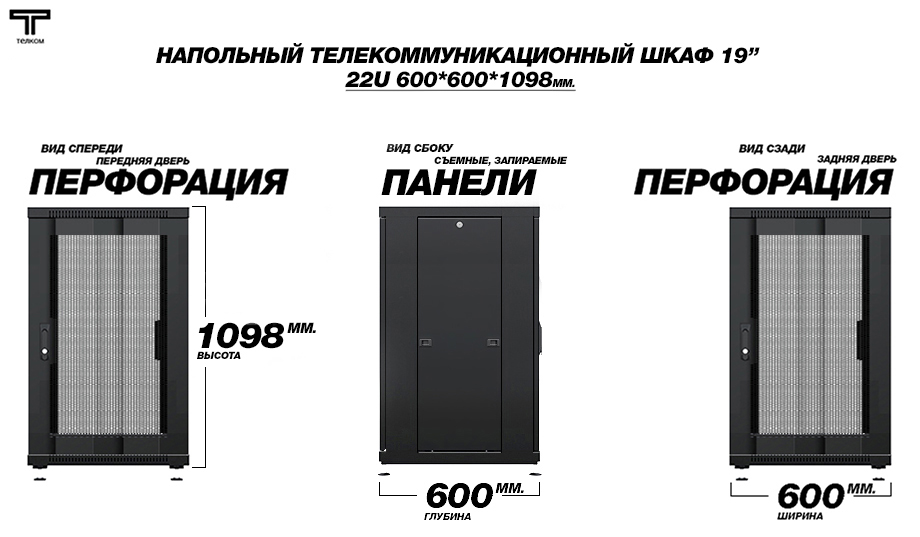 - Тип размера: 22U (ШхГхВ) 600х600x1098мм.