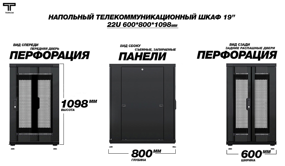 - Тип размера: 22U (ШхГхВ) 600х800x1098мм.
