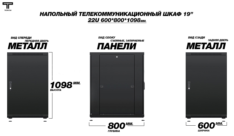 - Тип размера: 22U (ШхГхВ) 600х800x1098мм.
