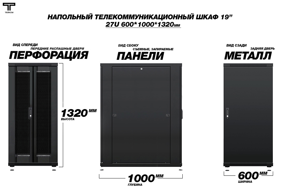 - Тип размера: 27U (ШхГхВ) 600х1000x1320мм.
