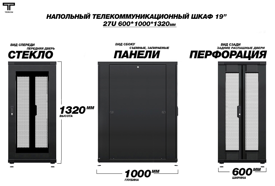 - Тип размера: 27U (ШхГхВ) 600х1000x1320мм.