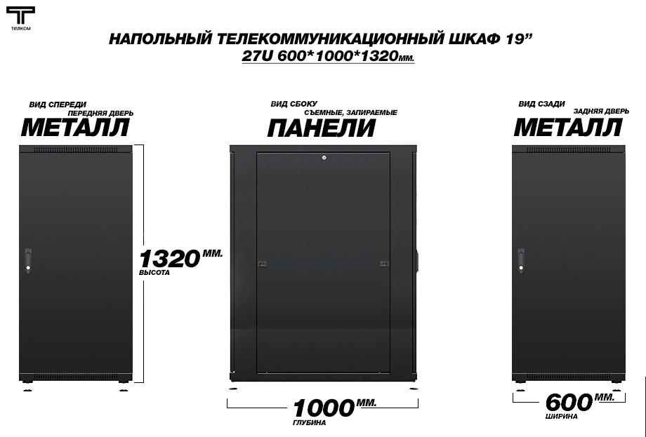 - Тип размера: 27U (ШхГхВ) 600х1000x1320мм.
