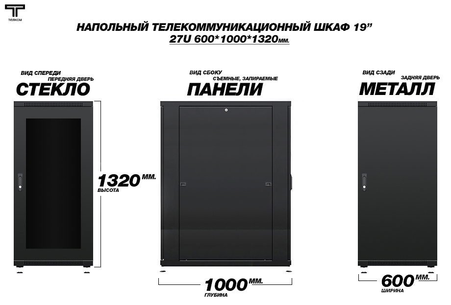 - Тип размера: 27U (ШхГхВ) 600х1000x1320мм.