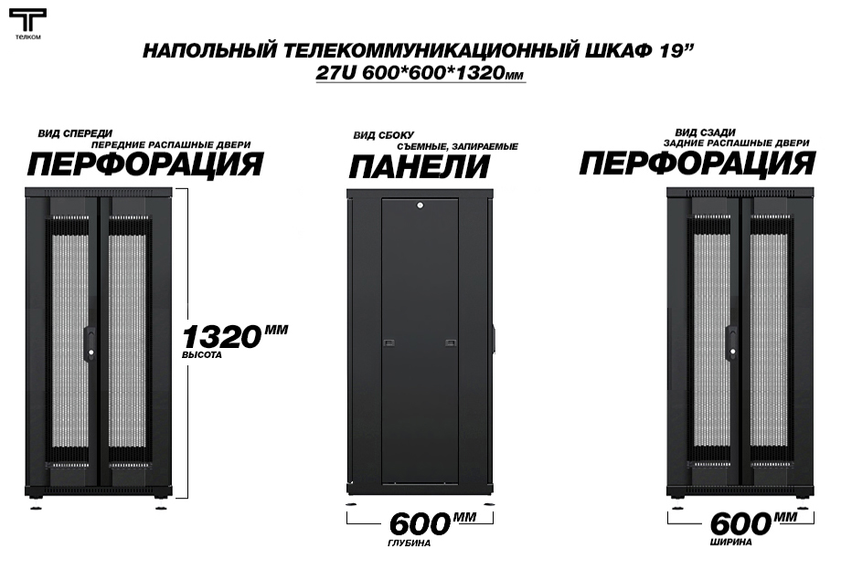 - Тип размера: 27U (ШхГхВ) 600х600x1320мм.
