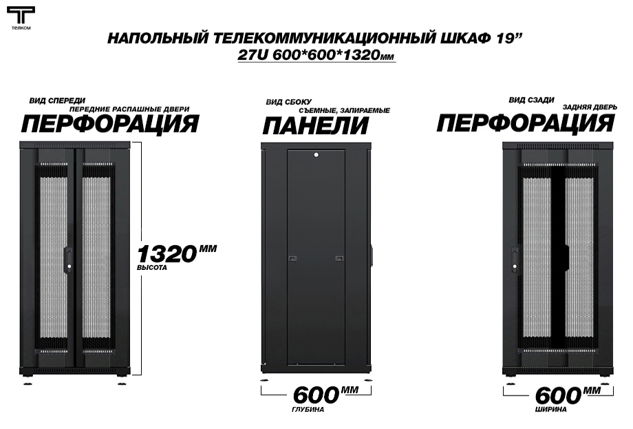 - Тип размера: 27U (ШхГхВ) 600х600x1320мм.