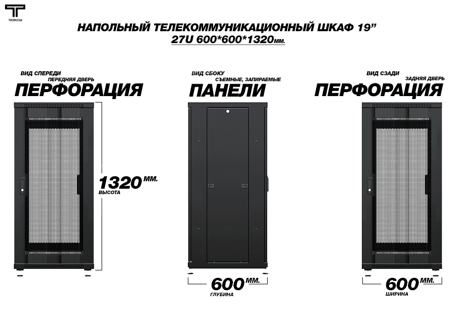 - Тип размера: 27U (ШхГхВ) 600х600x1320мм.