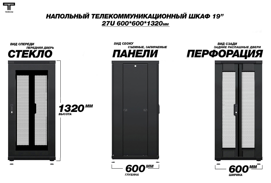 - Тип размера: 27U (ШхГхВ) 600х600x1320мм.