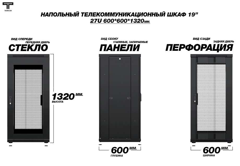 - Тип размера: 27U (ШхГхВ) 600х600x1320мм.