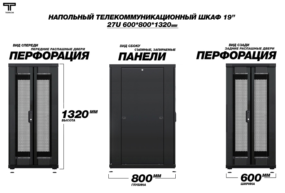 - Тип размера: 27U (ШхГхВ) 600х800x1320мм.