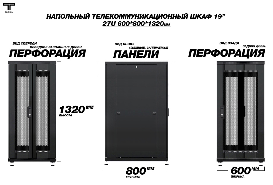 - Тип размера: 27U (ШхГхВ) 600х800x1320мм.
