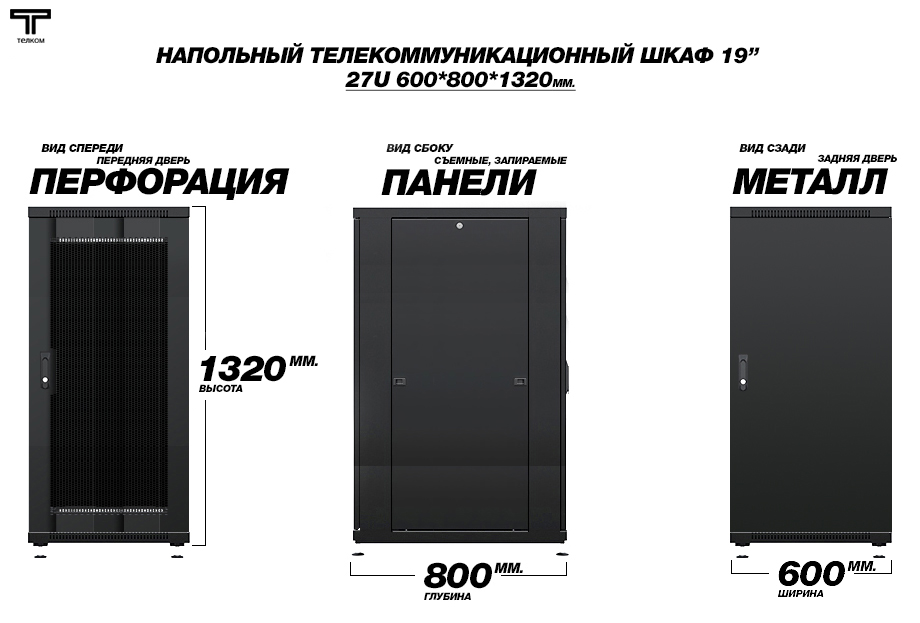 Шкаф напольный 27U телекоммуникационный 19" ТЕЛКОМ ТС-27.6.8-ПМ.9005М
