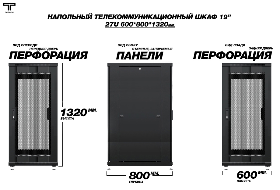 - Тип размера: 27U (ШхГхВ) 600х800x1320мм.
