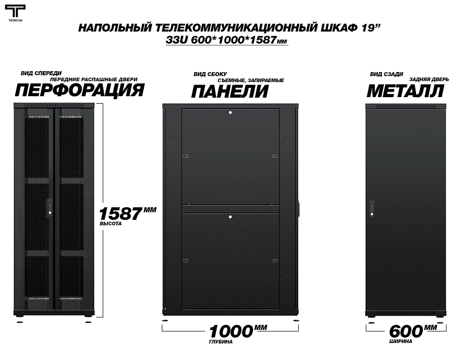 - Тип размера: 33U (ШхГхВ) 600х1000x1587мм.