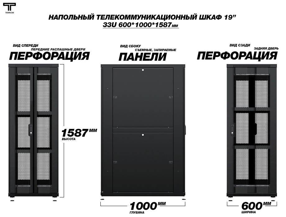 - Тип размера: 33U (ШхГхВ) 600х1000x1587мм.