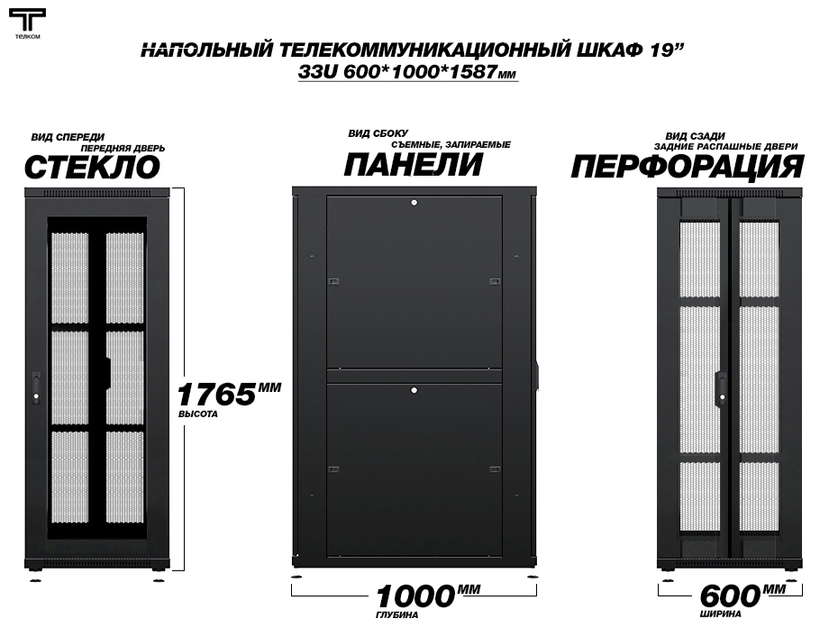 - Тип размера: 33U (ШхГхВ) 600х1000x1587мм.