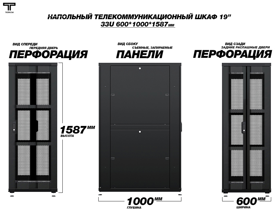 - Тип размера: 33U (ШхГхВ) 600х1000x1587мм.